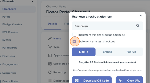 From the Checkouts section, click on the “Implement to Test Checkout” checkbox and copy the generated link.