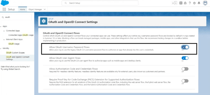 - If your Salesforce sandbox was created during or after Summer 2023, enable Username-Password Flow in OAuth and Open ID Connect Settings.